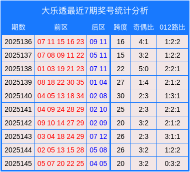 上期开奖号码的前区跨度为20,奇偶比3:2,012路比为0:3:2。
